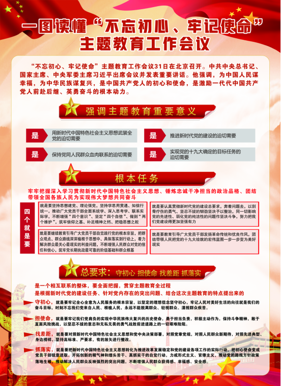 由集團(tuán)黨委副書記、總經(jīng)理劉玲同志宣讀《集團(tuán)黨委開展"不忘初心、牢記使命"主題教育實(shí)施方案》。集團(tuán)黨委書記、董事長王玉輝同志作了"不忘初心、牢記使命"主題教育動(dòng)員講話,對(duì)集團(tuán)系統(tǒng)開展主題教育工作進(jìn)行了安排部署,要求把主題教育與完成本單位轉(zhuǎn)型升級(jí)、項(xiàng)目建設(shè)、生產(chǎn)經(jīng)營等工作任務(wù)結(jié)合起來,切實(shí)把主題教育成果轉(zhuǎn)化為企業(yè)發(fā)展的強(qiáng)大動(dòng)力,推動(dòng)青海物產(chǎn)高質(zhì)量發(fā)展。省委"不忘初心、牢記使命"主題教育第十二巡回指導(dǎo)組組長任正德同志做了指導(dǎo)講話。充分肯定了集團(tuán)黨委的前期工作,認(rèn)為會(huì)議準(zhǔn)備比較充分,有效統(tǒng)一了干部職工的思想,制定的主題教育《實(shí)施方案》操作性強(qiáng),目標(biāo)任務(wù)具體,動(dòng)員講話政治站位高,思想認(rèn)識(shí)深,工作思路清晰。同時(shí),結(jié)合工作組的職責(zé)就落實(shí)主題教育各項(xiàng)任務(wù)講了六點(diǎn)意見。一是聚焦根本任務(wù);二是把握"十二"字總要求;三是緊扣"五句話"總目標(biāo);四是落實(shí)"四個(gè)貫穿";五是抓實(shí)"六項(xiàng)重點(diǎn)"舉措;六是力戒形式主義,嚴(yán)禁主題教育走形式、走過場。