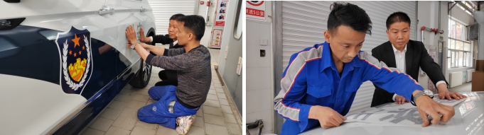 圖5為:售后漆工冶龍正在為警車貼警徽標志,他說:“警車是公務用車,每次粘警飾我都感到很神圣,干活兒特別用心細致,一定要把車身警飾做得非常好才行。警徽閃耀,守望千家萬戶。我是漆工也是工匠,必須精益求精,把活兒干漂亮,這也是汽貿(mào)漆工的臉面。每次我都把車清洗干凈,用卷尺量好間距,用記號筆畫好。在貼的過程中用刮板反復擠壓空氣,這樣才能使警徽粘得更牢固更美觀。我要把公司倡導的勞動精神、工匠精神,通過不斷地學習鍛煉,提高本領,把精湛的工匠手藝和貼心的服務傳遞給社會。