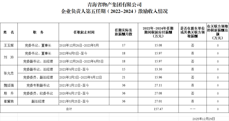 青海省物產(chǎn)集團有限公司企業(yè)負責人2024年度薪酬情況及第五任期(2022-2024)激勵收人情況